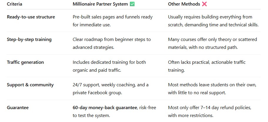 When it comes to building a digital business, many different approaches exist. The Millionaire Partner System differentiates itself in several important areas: it offers a more direct and guided path, aiming to minimize common errors and accelerate progress on the journey of building an online business, whereas traditional methods often require much more trial, error, and technical knowledge.